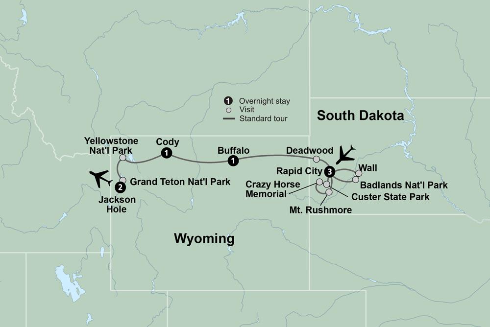 Stop in Deadwood, a rambling Western town and a National Historic Landmark. Recreations of turn-of-the-century streetlamps light the way through the restored architecture. A local guide introduces you to the history of the city, where gold, gambling and gunpowder were once the order of the day. Visit Mount Moriah Cemetery, final resting place of Wild Bill Hickok, Calamity Jane, and other figures from the Wild West. Then, it's your choice! Take a guided tour of the Adams Museum and explore dynamic exhibits that shine a light on Deadwood's legends and outlaws -OR- visit Kevin Costner's Tatanka: Story of the Bison. This interpretive center features large, awe-inspiring sculptures depicting the relationship of bison and the Lakota Native Americans. Your day ends in Buffalo, Wyoming.